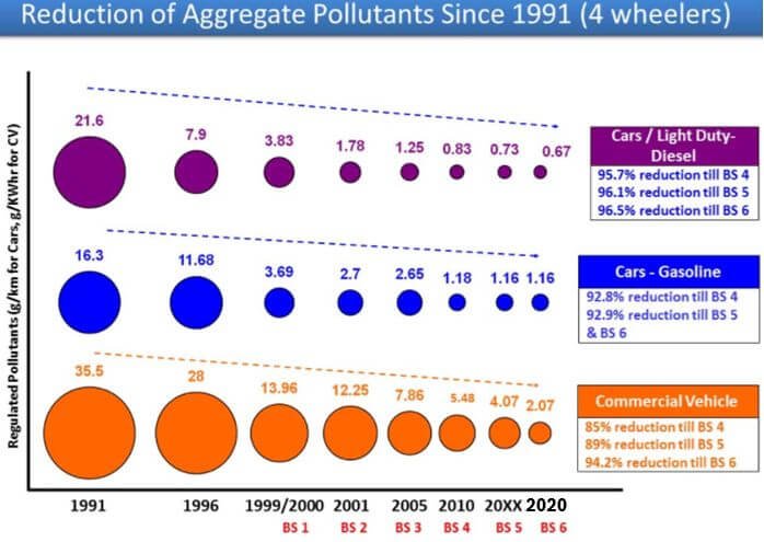 Due to the worsening air quality, there is an overwhelming concern for public health, as vehicular emissions are considered a large contributor to airborne pollution. As a result, the Govt of India decided to jump straight from BS-IV norms to the Bharat Stage VI norms which came into effect from 1st April 2020 for On-road vehicles i.e 2W-Scooters & bikes, 3W-Autos, 4W-Passenger cars, Buses & Trucks. The Bharat Stage VI (BS-VI) norms put limits on emissions of CO, HC, NOx, PM (Particulate Matter) and PN (Particulate Number). The new norms reduce NOx by 89% & PM by 50% from BSIV values & in addition have a new limit on the particulate count to 8×1011 (particles/kWh).